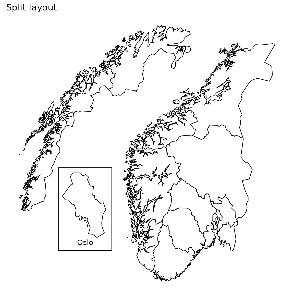 coordinates.sf: simple feature for spatial vector data. More on sf.We have 3 layout options for Norway map: default, split and insert Oslo.