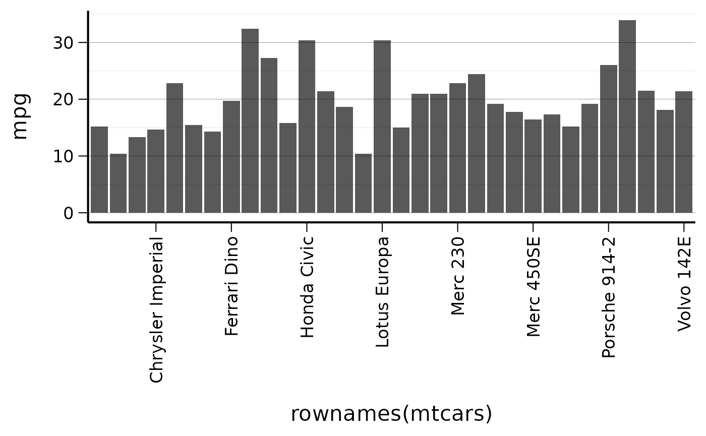 ggplot(mtcars, aes(x = rownames(mtcars), y = mpg)) +