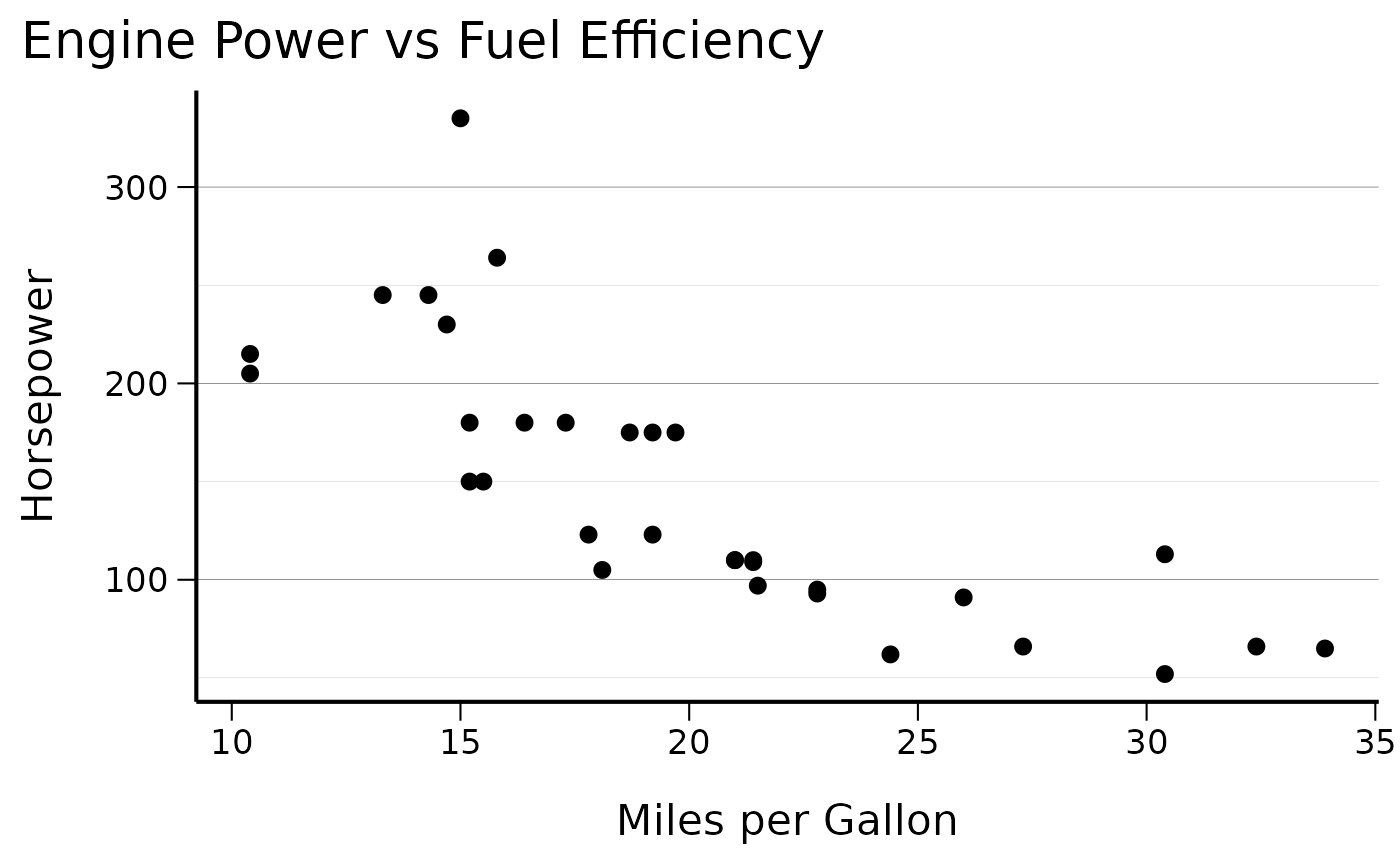 ggplot(mtcars, aes(x = mpg, y = hp)) +